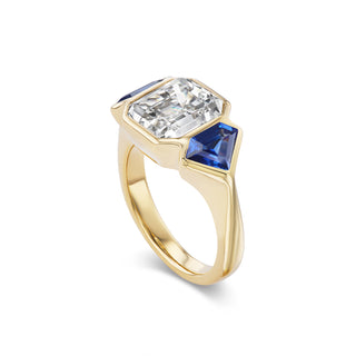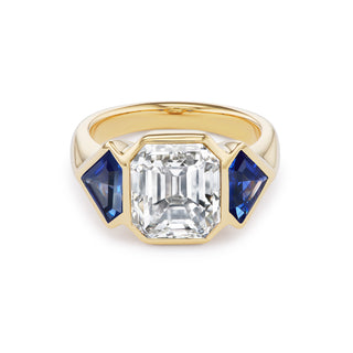 One-of-a-Kind BNS Ring with Emerald-Cut Diamond and Blue Sapphires Shields